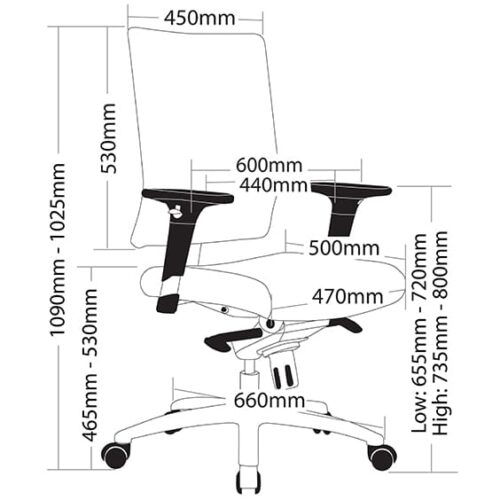 FEATURES: Â Adjustable seat height Adjustable seat and back angle Adjustable weight tension Adjustable arms Lumbar support Butterfly mechanism 600mm black