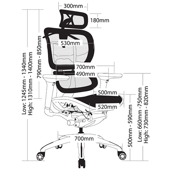 FEATURES: Adjustable seat height Adjustable seat and back angle Adjustable weight tension Adjustable seat depth (seat slider) Available in high